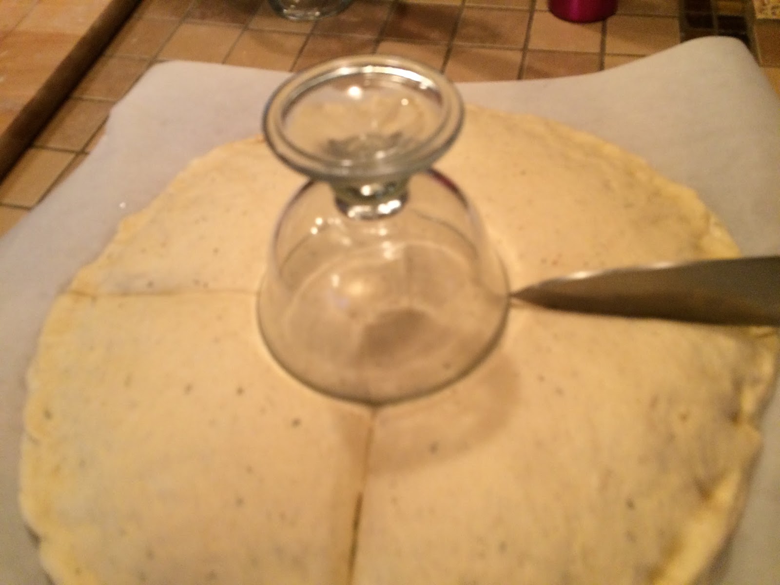 Now for the shaping of the bread itself. Put a small bowl, upside down in the middle of the bread, just let it sit there. It is going to be the guide for where to end each cut.